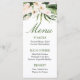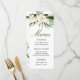 O cartão de menu tropical apresenta um motivo aquoso de verde e flores exóticas cor-de-rosa macio. Perfeito para uma praia elegante, um destino ou um casamento ou chá de panela temático de luau. Disponível em vários tamanhos. Personalize o texto na sua escolha de fontes e cores.