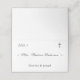 O design frontal apresenta um fundo branco para o nome do convidado, que é exibido em uma fonte elegante e cor de prata. Um florescimento delicado é ilustrado de ambos os lados do nome. O canto superior esquerdo apresenta o número da tabela na mesma fonte elegante. Uma cruz de cor prateada é exibida no canto superior direito. Os primeiros nomes do casal são exibidos abaixo em um impressão nítido. Dentro design consiste na sua mensagem de gratidão sobre um delicado florescimento. O fundo é branco. Também disponível em cor-de-champanhe e coordenadas com a "Suíte de Casamento Simplesmente Católica".