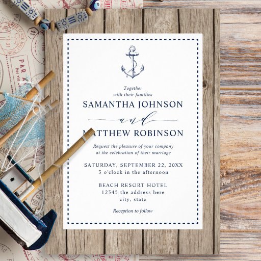 Quando você está tendo um casamento inspirado na praia e quer um pouco de reviravolta rústica que esta suíte de casamento realiza ambos. Este design apresenta um fundo de madeira rústico, uma borda de traços e uma âncora azul marinho náutica.