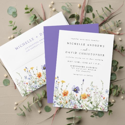 Este design apresenta uma borda colorida de flores silvestres de aquarela em tons de roxo, ouro, verde e azul.