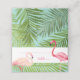 Cartões de escolta dobrados por na moda apresentam um design no estilo tropical com dois flamingos cor-de-rosa e padrões de folhas verdes de palma e tiras de cabana cor-de-rosa.