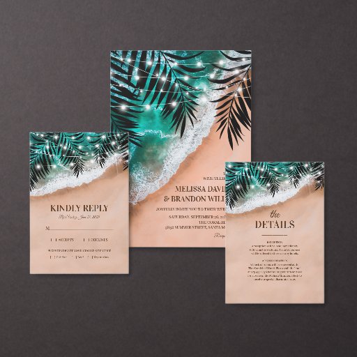 Cartões de destino de praia com uma costa arenosa tropical, ondas oceânicas, folhas de palma românticas e duas linhas para escrever os nomes dos convidados.