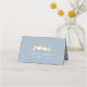 Cartão romântico de núpcias, com duas folhas de ouro... e pomares em fundo azul empoeirado. A fonte de script elegante para nomes e datas adiciona um toque suave e pessoal. Perfeito para atribuir lugares de recepção com estilo e charme. Coordena-se com a suíte de casamento Dusty Blue e Dourada Lovebird para um evento coeso. Facilmente personalizável com nomes de convidado para um monitor de assentos polido.