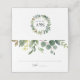 A placa botânica chic ou a design de placa de mesa apresenta uma borda superior de folhagem verde de cor aquosa de eucalipto. Espaço fornecido para nome de convidado e número da tabela. Cartões inversos para revelar uma coroa botânica correspondente com suas iniciais e dentro de data de casamento. Projetado para combinar nosso casamento e coleção de eventos Eucalyptus Grove.