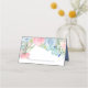 Aqui está um cartão de casamento dobrado e bonito que apresenta uma borda superior de imagens azuis, cor de pêssego e flores cor-de-rosa aninhadas entre o verde macio. Seu texto personalizado está em azul no fundo em um fundo branco. O outro lado da placa tem uma imagem de flor de solteiro correspondente, com mais dois campos de texto para personalização. A parte traseira da placa é azul consistente. Muito apropriado para primavera e casamentos de verão. *Este design usa trabalho de arte de LABFcreations.