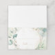 Cartão de lugar dobrado de casamento moderno, com folhas de eucalipto e verde em volta de uma falso estrutura geométrica de ouro, sobre uma lavagem a aquarela pastel. A dentro é uma sombra correspondente de verde azul macio. Esta elegante e rústica design é excelente para um casamento de temas botânicos no verão.