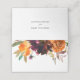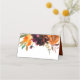Cartão de casamento floral russo de cor d'água com um buquê floral pintado de cor d'água com tons quentes e úmidos de laranja queimada, terracota e burgundy profunda junto com um pouco de verde. Este elegante cartão de lugar dobrado em vazio com os tons ricos do outono é excelente para um casamento outono.