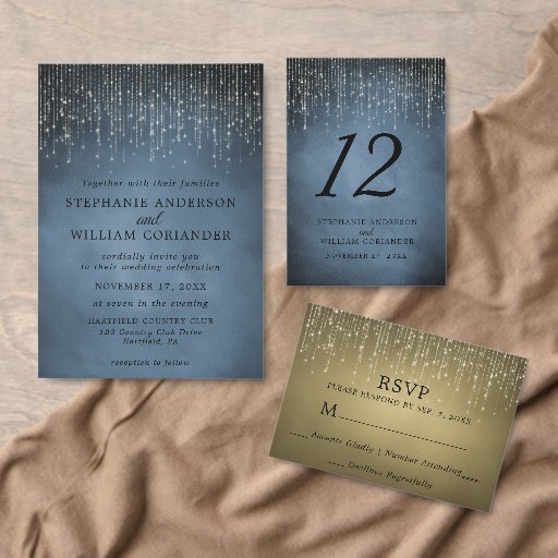 Estes cartões são perfeitos para casamentos e outros eventos especiais. Eles apresentam uma ilustração das luzes espumantes de cordas contra um fundo dourado ou ouro. A frente tem um espaço para você escrever no nome do seu convidado e no número da tabela. O reverso está pronto para ser personalizado com seus nomes e data de casamento em elegante impressão preto.