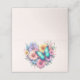 A place card with a beautiful illustration. A heart-shaped bouquet of flowers in pastel blue, green, purple and yellow. With a lovely blue butterfly hovering in front.