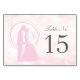 Um cartão de mesa com uma bela design de casamento romântica das silhuetas de beijos enquadradas da noiva e do noivo contra um fundo rosa sonhador.