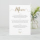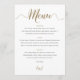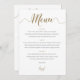 Cartão de menu de casamento Dourado com um cabeçalho de fonte de script de caligrafia. Para ver o gráfico Sentado e os Números de Tabela correspondentes, consulte a minha loja Zazzle.