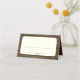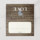 Frasco russo com flores azuis sobre fundo de madeira de celeiro, cartão de assento dobrado com área branca para nomes de escrevendo manual e números de mesa e nomes personalizados e mensagem no verso.