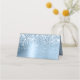 Você pode alterar a cor preta das linhas e o rótulo de texto na parte frontal dessas placas de lugar. É usada uma simples fonte moderna e uma caligrafia elegante, mas a cor e o estilo também podem ser personalizados. Brilhante azul claro e estilo metálico da arte digital em folha, com gráficos brilhantes brancos em cartões de lugar dobrados para o seu casamento moderno.