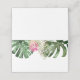 Cartão de lugar com tema tropical moderno apresentando ilustração em aquarela de folhas de monstera, folha de palmeira e flor de protea rosa. Perfeito para o seu casamento de verão, chá de noiva, chá de bebê ou festas de aniversário.