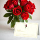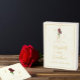 elegância do eterno: Casamento de rosas vermelhas minimalista tradicional com tipografia de guião dourada e fundo de marfim.