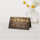 Cartão de lugar dobrado com lenha e lanternas, com área branca para nomes de escrevendo manuais e números de mesa e nomes personalizados e mensagens no verso.