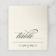 Cartão de escolta de estilo dobrado elegante em marfim branco suave/claro (a cor de fundo pode ser personalizada) e esquema de cor preta. Apresenta escrevendo de script de caligrafia e sotaque design de rolagem.