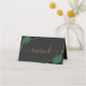 Este elegante cartão de lugar reservado para mesa de casamento, moderno, apresenta uma imagem esmeralda verde aquarela, feita com brilho dourado em cantos opostos. A palavra "reservado" aparece num guião dourado com manuscrito com inchaço antes e depois num fundo preto em ambos os lados do cartão.