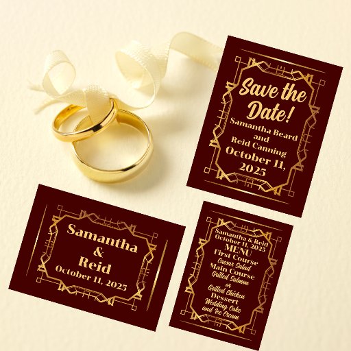 Apreciem os vossos convidados com este magnífico tributo "ouro-a-burgundy" à tendência de design da Arte Deco da década de 1920. Especialmente adequado para casamentos noturnos formais e casamentos de inverno e outono.