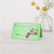 Este cartão de lugar dobrado para suas festas, eventos e casamentos é verde-claro com o Papai Noel cavalgando um trem vermelho e branco com rodas de chocolate picante canas de carregando e cartas para Papais noeis. Personalize o nome e a área do número da tabela e o texto no verso com os modelos.