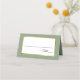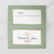 Design de placa de lugar simples e elegante, com um roteiro moderno em texto preto, com palmeira artística em um quadro metálico de ouro. Um plano de fundo verde de sábado de coordenação está na dentro frontal e traseira da placa dobrada. Entre em contato comigo se precisar de ajuda ou de um pedido personalizado.