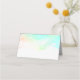 Cartões de lugar dobrados com uma borda de abstrato ao longo da parte superior com cores irregulares verdes e azuis. Um design suave e suave. Uma textura clara e crocante atrás da imagem.