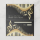 Ilustração preta e dourada de um teclado musical com anotações e clave e ouros brilhantes