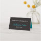 Estas cartas românticas de casamento dobradas a preto e branco têm uma imagem de um par de corações unidos sobre uma fita turquesa e uma imagem de arco que atravessa a largura da frente da placa de lugar. Os textos azul e preto turquesa sobre fundo branco são impressos acima da faixa de opções para que você escreva os seus nomes de hóspedes. Os nomes da noiva e do noivo, juntamente com a data do casamento, são impressos no verso do cartão de lugar em turquesa e branco sobre um fundo preto com uma mensagem personalizável adicional que diz, "Obrigado por celebrar conosco!".