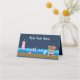 Este cartão de lugar bonito e divertido apresenta um urso marinheiro náutico num convés de madeira com uma gaivota e um caranguejo. Ao fundo há um farol rosa e branco, um pássaro giro em um veleiro, ondas oceânicas e um marinho azul estrelado céu noturno. O texto combina fontes em negrito e sem serifa para uma aparência na moda e moderna. Isto é perfeito para um chá de fraldas temático náutico.