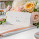 Cartões de lugar chiques e caprichos com fonte casual e escrita à mão. Os cartões de lugar vêm num esquema de cores divertidas de verde-selva e rosa.