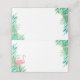 Carteira de casamento encantadora com um flamingo e um verde brilhante, cheios de textura de aquarela impressa. O dentro apresenta um padrão de folha tropical correspondente em rosa e branco.