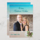 Cartões de foto de Natal de praia com saudação e assinatura personalizadas na frente de placas planas. Adicione uma foto horizontal (paisagem) de família, casal ou solteiro sobre uma imagem de fundo do litoral com água azul tropical e areia da praia. Starfish, holly e a imagem de dólar enfeita o canto inferior para melhorar o tema tropical.