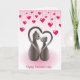 Gato masculino e feminino com as caudas amontoadas para formar um coração e tocar narizes com corações cor-de-rosa balançando e as palavras Feliz Dia dos Namorados no fundo. A dentro do cartão tem o texto: Somos Puro Juntos! que pode ser mudado.