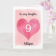 Um cartão de aniversário bonito, cor-de-água, rosa e vermelho, do 9° aniversário, que pode ser personalizado na frente com o nome da aniversariante. A mensagem da placa dentro e a parte traseira da placa também podem ser editadas. Este cartão de aniversário bonito do 9º aniversário para a filha, sobrinha, neta, etc, faria um cartão de aniversário único para ela.