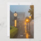 Uma encantadora cena de rua com luzes brilhantes e compras decoradas, suavemente iluminadas através da névoa noturna, criando uma atmosfera quente e convidativa.