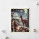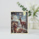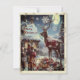 Cartão de Natal. A neve cobriu a cena mostrando crianças encontrando uma rena com uma pilha de presentes embrulhados fora de casa na véspera de Natal.