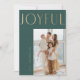 Cartão com fotos moderno e mínimo de férias com uma foto grande em um fundo verde escuro. Letra falsa em ouro lê Joyful em uma fonte moderna. A parte traseira da placa apresenta uma segunda saudação pessoal e foto, juntamente com seus nomes.