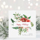Este belo cartão de feriado quadrado apresenta elegantes flores vermelhas de aquarela com groselhas ocas, pinecones e verde sobre fundo branco com um 'Feliz Feriado' em um elegante roteiro manuscrito | caligrafia. A parte traseira do cartão inclui uma mensagem para personalização. Localize itens correspondentes na Coleção de Natal Botânico de inverno Vermelho Feriado.