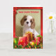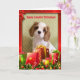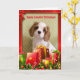 Este é um cartão de Natal com uma fotografia original do mais adorável cachorrinho Blenheim Cavalier King Charles Spaniel, sentado em frente à sua pilha de presentes.