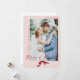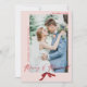 Este cartão de Natal para recém-casados é clássico e simples, mas ainda assim caprichoso. Compartilhe sua foto de casamento da noiva e do noivo com amigos e familiares neste design que apresenta as palavras "Merry and Married" em caligrafia cursiva acentuada por uma fonte serifada. Sua foto de casamento é acentuada por um arco vermelho pintado à mão em aquarela para adicionar um toque feminino de Natal!