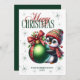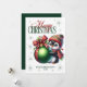 Envie votos calorosos de férias com este adorável cartão de Natal com um pinguim fofo usando um chapéu e cachecol xadrez vermelhos e segurando um enfeite verde festivo envolto em um laço xadrez vermelho. Flocos de neve brilham em torno da cena alegre, tornando-o uma escolha perfeita para saudações familiares. O cartão pode ser personalizado com o nome da sua família e o ano, criando um enfeite encantador para as festas de fim de ano.