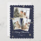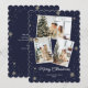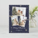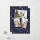 Cartão de Natal azul com flocos de neve e estrelas sobre fundo azul escuro de neve. Personalize facilmente este cartão de feriado moderno com as suas fotografias favoritas.
