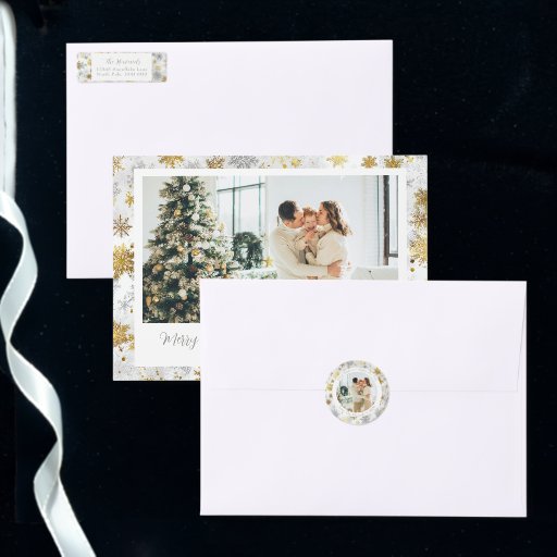 Celebre a temporada em estilo sofisticado com esta carta de Natal redonda da minha coleção de dourado cintilante e flocos de neve prateada. Projetado para se destacar das placas retangulares tradicionais, este formato circular adiciona uma reviravolta moderna e divertida aos seus cartões de natal — perfeita para enviar mensagens para amigos, familiares ou clientes. Uma festiva borda de flocos de neve em ouro e tons prateados rodeia sua foto personalizada, evocando o aspecto de brilho e folha metálica sem a bagunça ou a despesa. No topo, uma mensagem alegre de "Feliz Natal e Feliz ano novo" é lindamente escrita como script, enquanto que no fundo há espaço para uma nota personalizada ou nome da família e ano. Impresso em estoque de cartão de alta qualidade com acabamento suave, esta placa oferece uma sensação premium que é fácil de gravar e parece bonita exibida em mantas, geladeiras ou telas de cartão de feriado. Ele vem com um envelope branco de coordenação para fácil envio. Como designer, eu criei esta carta para misturar o charme de feriado do eterno com um toque de brilho moderno. É uma maneira perfeita de compartilhar calor e alegria nesta estação — maravilhosa e exclusivamente. Se precisar de assistência com o design ou produtos correspondentes, envie-me um e-mail para zazzle@fivelittlelemons.com