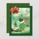 Cartão de Natal com um papagaio verde vestindo um chapéu verde de Papai Noel sentado numa árvore.