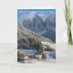 Cartão de Natal com "Feliz Natal e Feliz ano novo!", com uma igreja na neve com os Alpes Dolomites no Tirol do Sul, Itália.