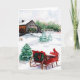 Cartão cénico do moinho de vento do trenó da neve da fazenda do feriado do Natal. Uma fazenda cénico coberto de neve elegante com um passeio e um moinho de vento do trenó. Cartões de natal bonitos e elegantes.