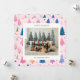 Cartão de Natal com ilustrações de árvores de Natal fofas em uma paleta de cores pastéis com uma foto da família emparelhada com uma saudação de Natal e seu nome e ano em uma fonte sem serifa.