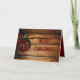 Um simples ornamento vermelho contra madeira de celeiro velha faz um cartão de natal quente e único. Personalize-o com a sua própria mensagem pessoal,