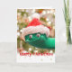 Um design de cartas de Natal divertido e fotográfico com um sorriso de marionete verde, com olhos googosos, vestindo um chapéu de Papai Noel. A marionete é colocada contra um borrão festivo de um livro de uma árvore de Natal decorada com luzes. Há também algumas estrelas em queda com efeito de brilho digitalmente simulado. Na parte inferior do design, figura o texto "MERRY CHRISTMAS" no interior de um efeito de neve. NOTA: o efeito de brilho nas estrelas é simulado digitalmente no trabalho de arte, não se usará nenhum brilho ou folha no fazer deste cartão. Design e fotografia de Natalie Kinnear