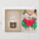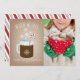 Um cartão de Natal com ilustração de um jarro de mason de chocolate quente, picado com uma cana doce e flocos de neve. O plano de fundo na frente é o estoque de cartão inspirado. O fundo ao contrário é vermelho e listras brancas de cana doce. Personalize o texto e a foto.